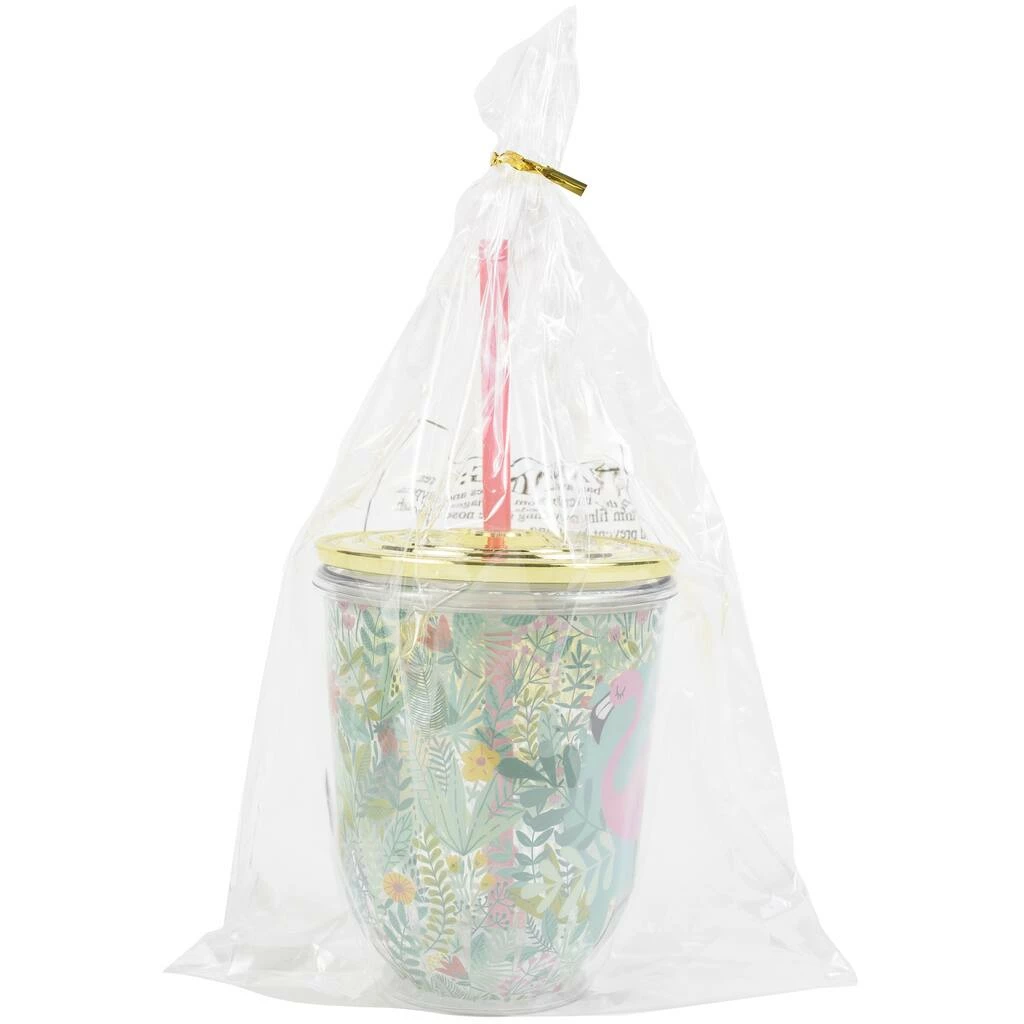 Keep cold drinks cool and hot drinks warm with this bright and colorful tropical themed reusable cup! Straw included!