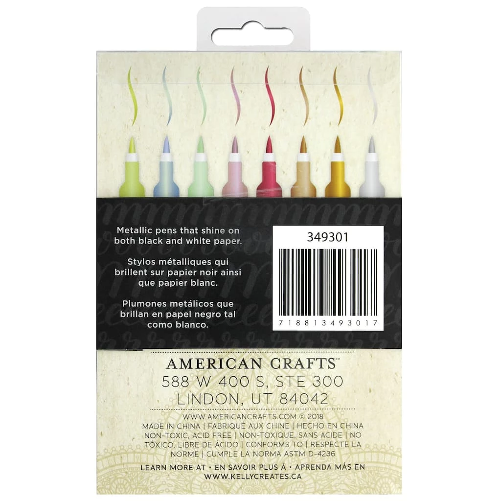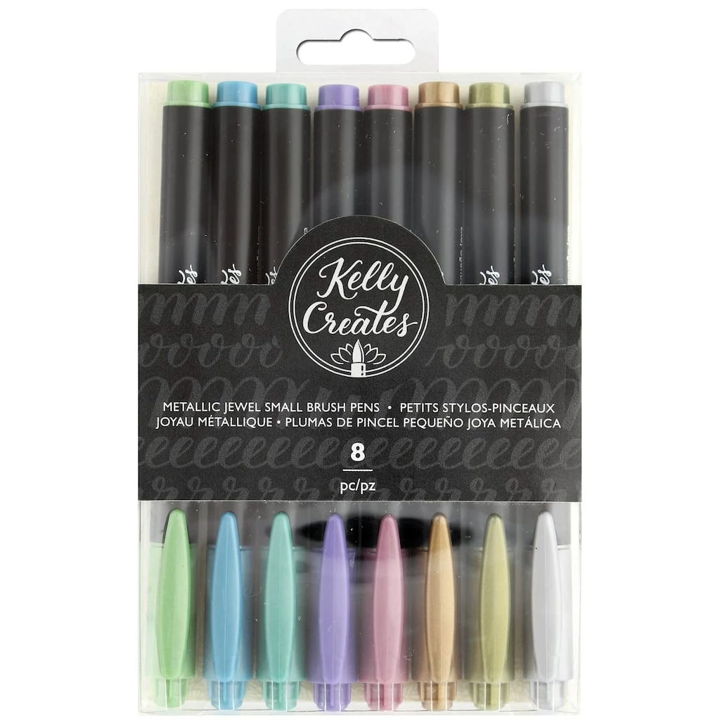 This set of jewel-toned brush pens from Kelly Creates contains eight metallic hues that shine on both black and white paper. Set colors include silver, emerald, sapphire, jade, amethyst, ruby, bronze, and gold.