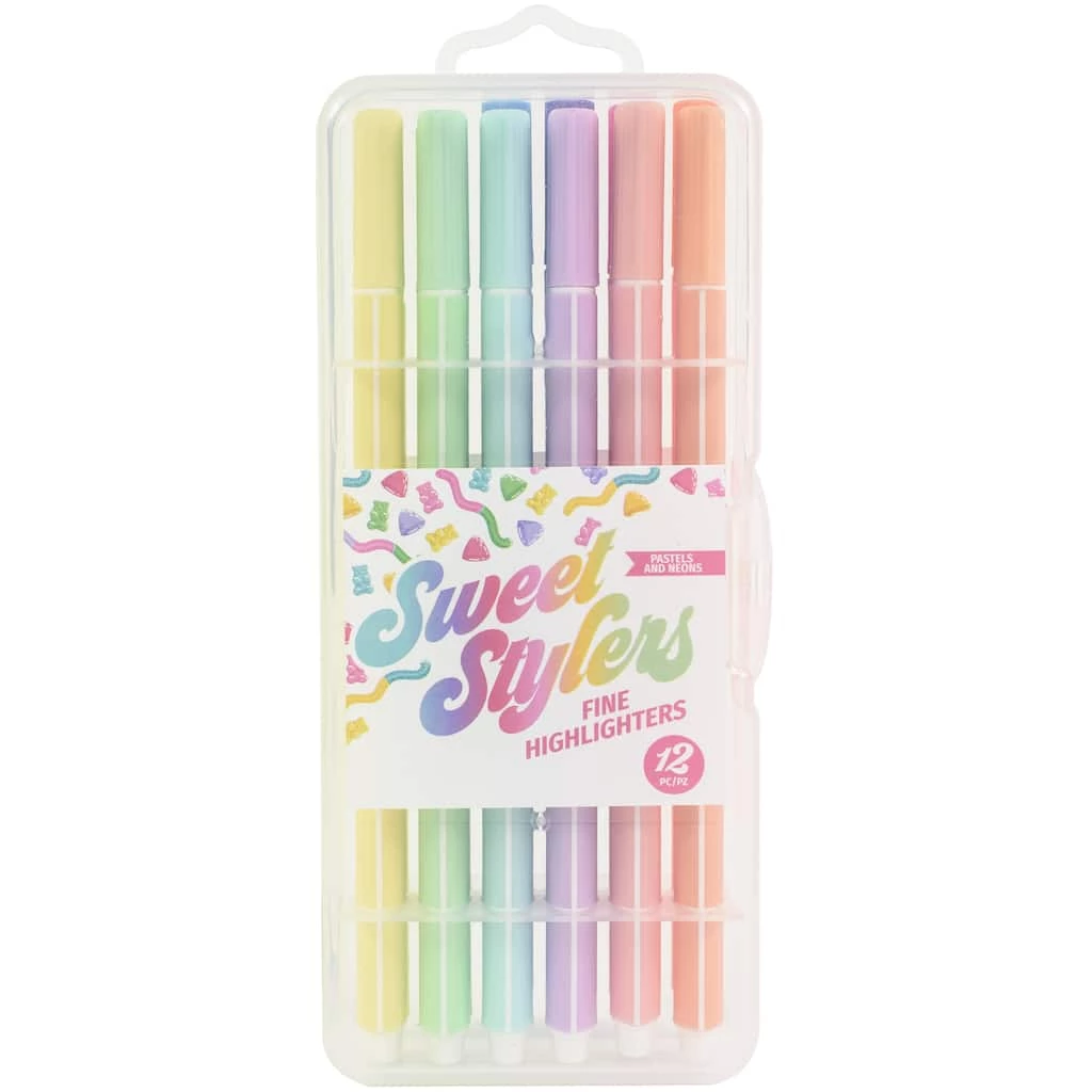 Sweet Stylers are perfect for journaling, planners, paper crafting and more. This package contains 12 fine chisel tip highlighters in a mix of neon and pastel colors.